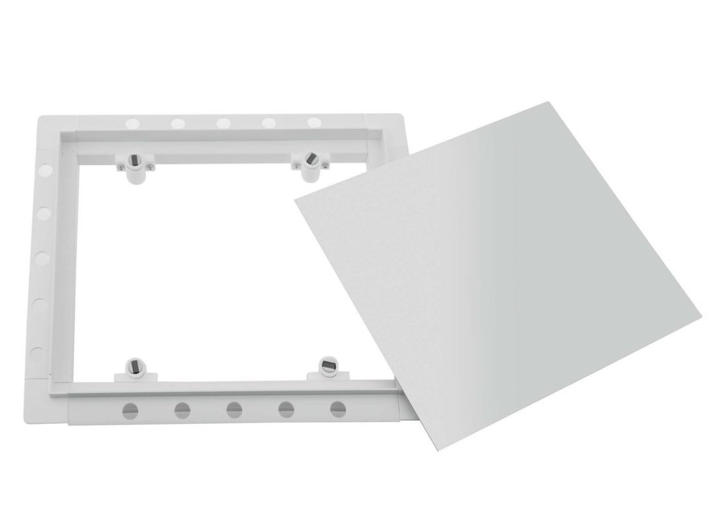 Poté dvířka vyjmeme a rámeček zabudujeme pod obklady zároveň s okolním obkladem. Rámeček je skládací. Rozměr můžeme měnit s tolerancí +/-5 mm. Dvířka dorovnáme pomocí stavitelných magnetů se závitovým spojením.