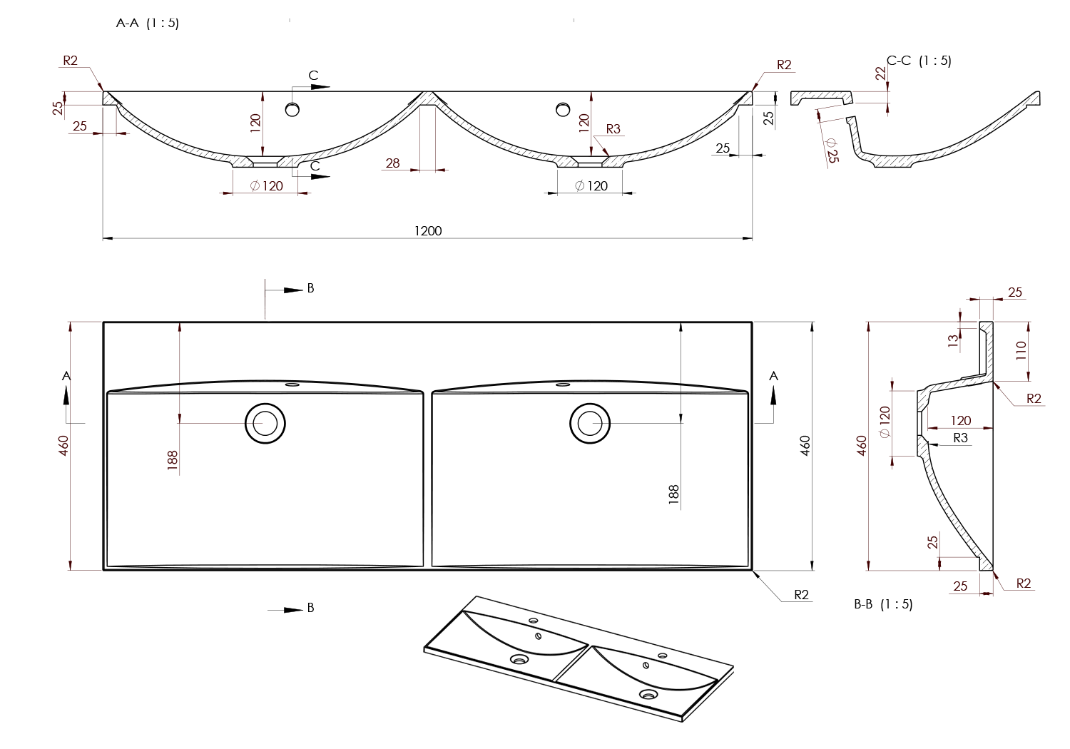 MARIA dvojumyvadlo, litý mramor, 120x46cm, bez otvoru, bílá