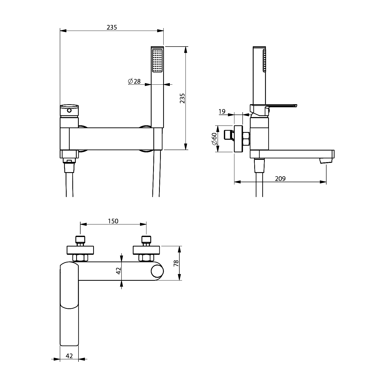 MIXONA nástěnná vanová baterie s ruční sprchou, otočné ramínko, chrom