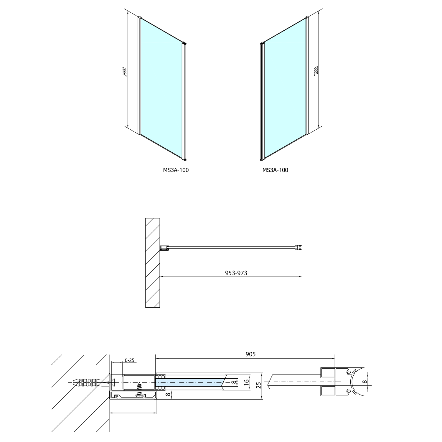 Koncept zástěn MODULAR SHOWR nabízí moduly skel s profily pro snadnou montáž. Skla jsou vespodu opatřena hliníkovým profilem, který dodává zástěnám elegantní vzhled, lépe těsní a usnadňuje manipulaci a instalaci. Dle rozměrů skel je vždy nutno dokoupit potřebnou vzpěru pro zajištění stability zástěny. Vzpěry jsou zhotoveny z nerez oceli a lze je libovolně zkracovat, řez je schován v zakončovacích dílech (vyjma rohových vzpěr, které nelze upravovat).