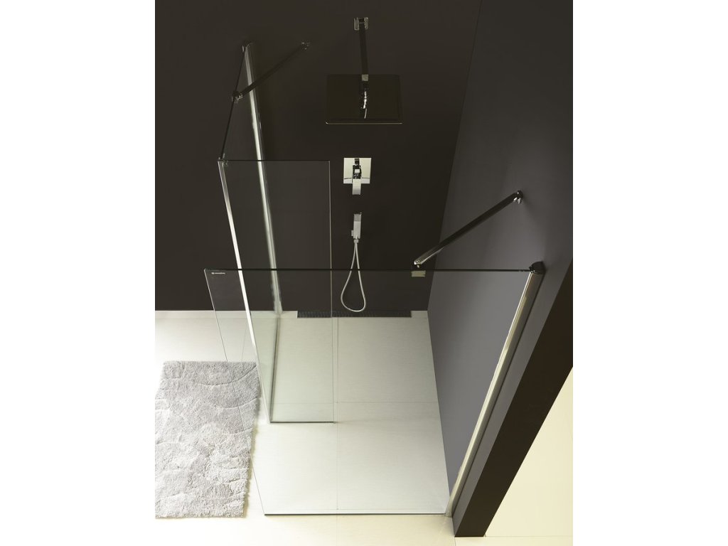Aby vznikla dvoudílná zástěna ve tvaru "L", je potřeba k pevné stěně dokoupit přídavný pevný panel MS2B.