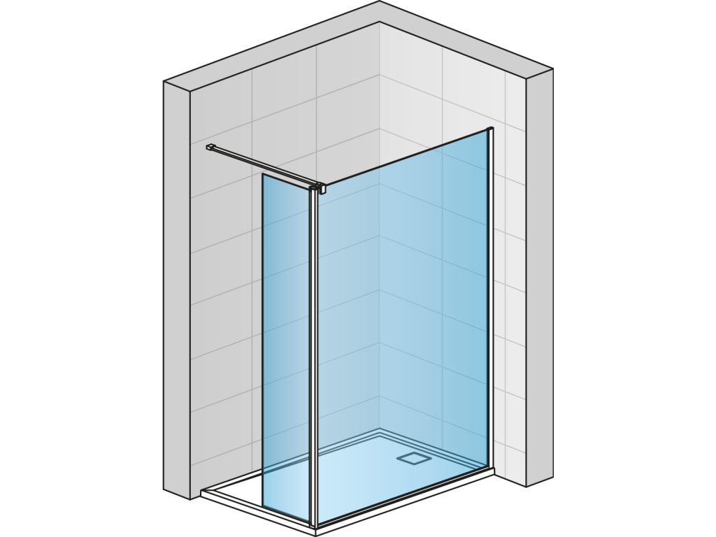 Montážní set s krátkou otočnou stěnou v 90° v matné černé barvě ze 6mm bezpečnostního skla. Kotvicí a spojovací profil + krátká otočná stěna o šířce 421 mm. Délka vodorovné/stropní vzpěry 1500 mm. Maximální výška pro kotvení je 3000 mm. Digitální tisk (černá keramická barva) na přední straně skla. Krátká otočná stěna částečně zamezí stříkání vody ze sprchovacího prostoru.Doplňkové parametry