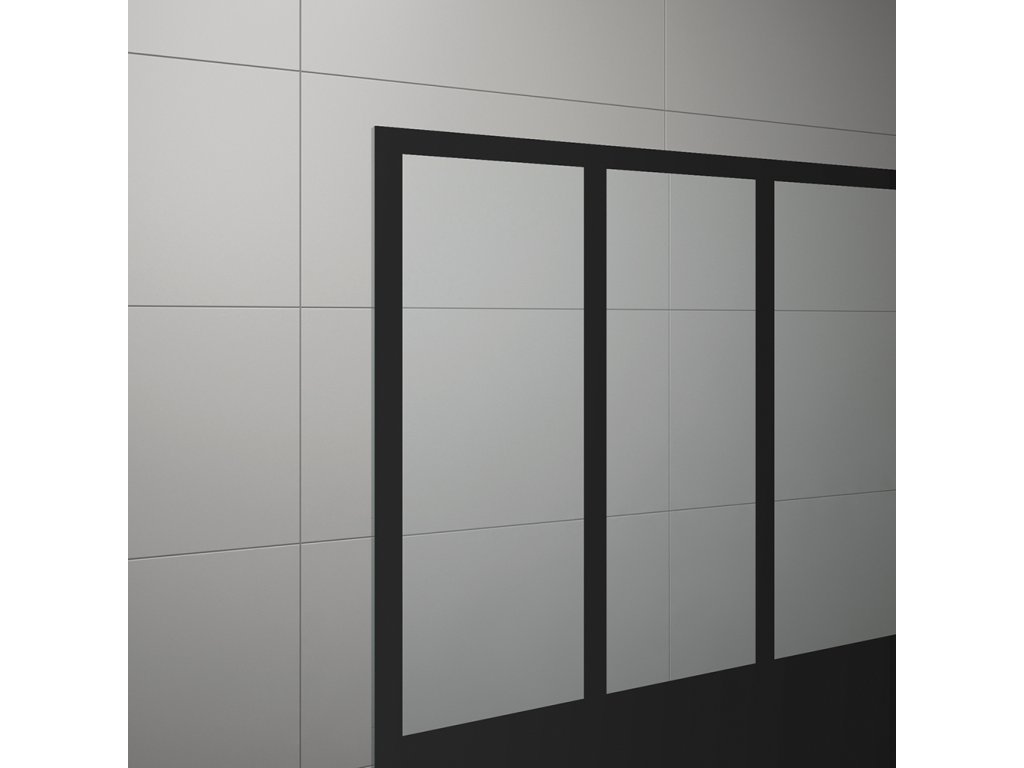 Montážní set s krátkou otočnou stěnou v 90° v matné černé barvě ze 6mm bezpečnostního skla. Kotvicí a spojovací profil + krátká otočná stěna o šířce 421 mm. Délka vodorovné/stropní vzpěry 1500 mm. Maximální výška pro kotvení je 3000 mm. Černý sítotisk na přední straně skla. Jedná se o montáž vpravo, nutno rozlišit v objednávce. Krátká otočná stěna částečně zamezí stříkání vody ze sprchovacího prostoru.Doplňkové parametry
