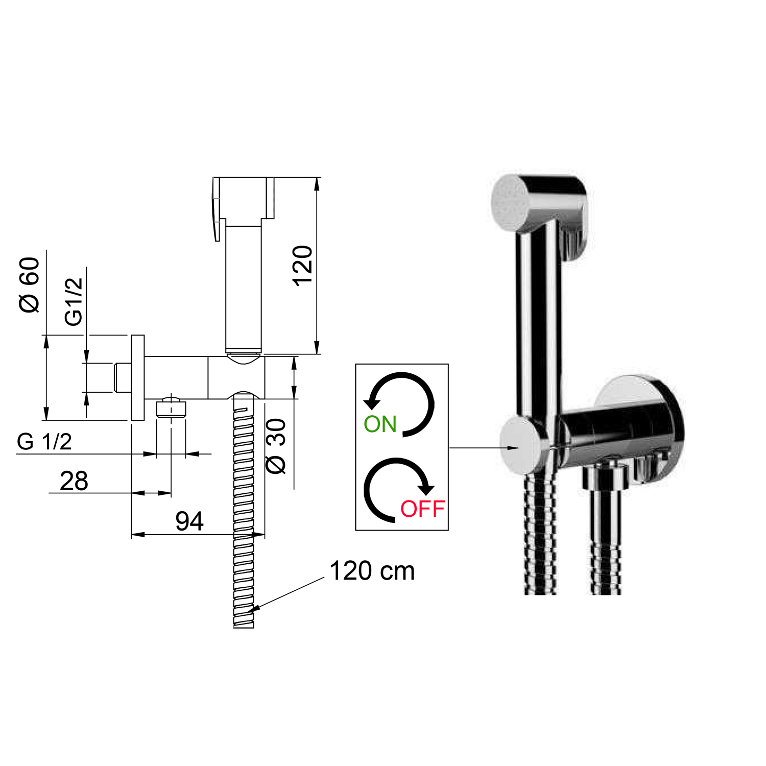 Nástěnný ventil s ruční bidetovou sprškou a bezpečnostní pojistkou,kulatý,chrom