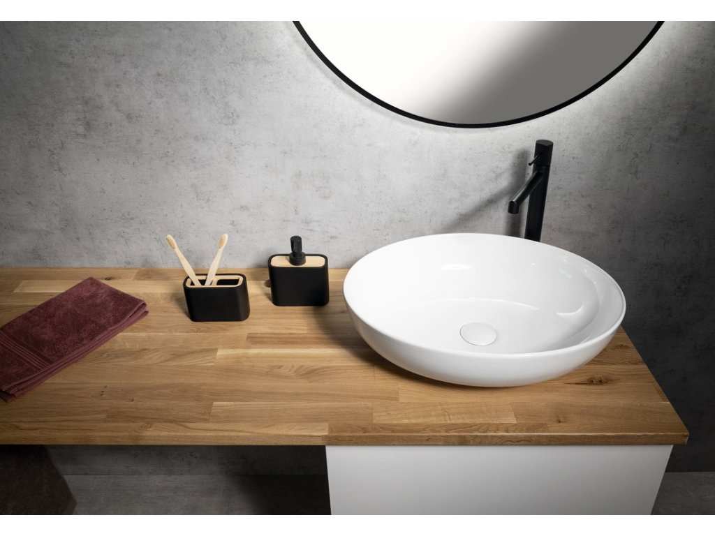 Kombinace dřeva a bílé a černé barvy je nesmrtelná. Ve spojení se zaoblenými hranami činí kolekci doplňků na postavení NINFEA elegantní a neodolatelně krásnou. Oko potěší a užitek přinese v každé koupelně.