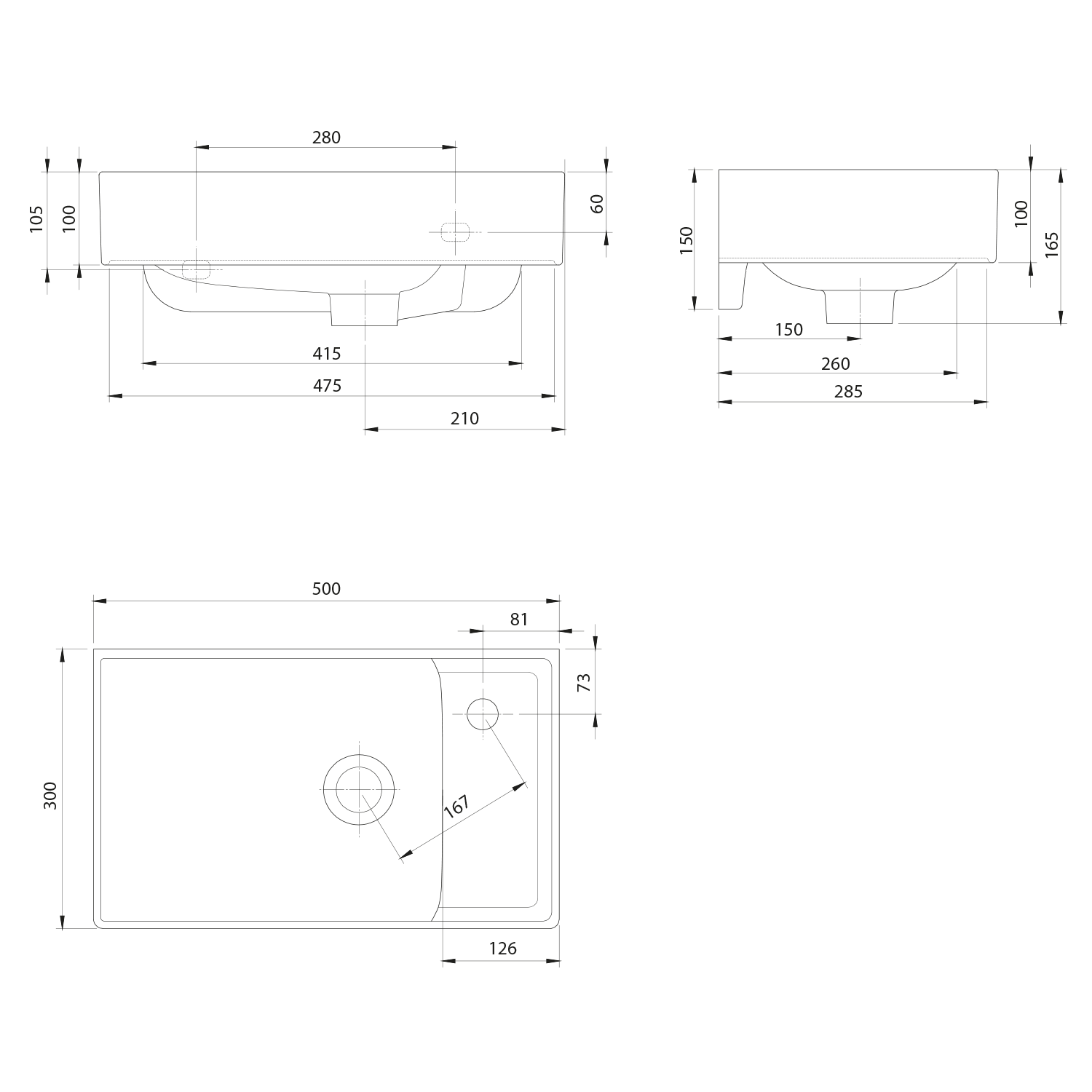 NUALI keramické umývátko 50x30cm, baterie vpravo, bílá