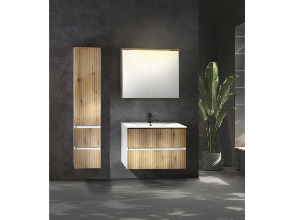 Kolekce PANEDA je minimalistický moderní koupelnový nábytek s bezúchytkovým otevíráním. Skříňky jsou ve variantě bílá lesk a v kombinaci bílého korpusu a čel v dub emporio, provedení strip. V nabídce jsou nejžádanější rozměry umyvadlových skříněk 60 - 120 cm s oblíbenými keramickými umyvadly SLIM, které doplňuje vysoká doplňková skříňka s dvířky a 2 praktickými zásuvkami. Umyvadlové skříňky jsou vybaveny zpomalovacími výsuvy s dotahem od firmy Hettich.
