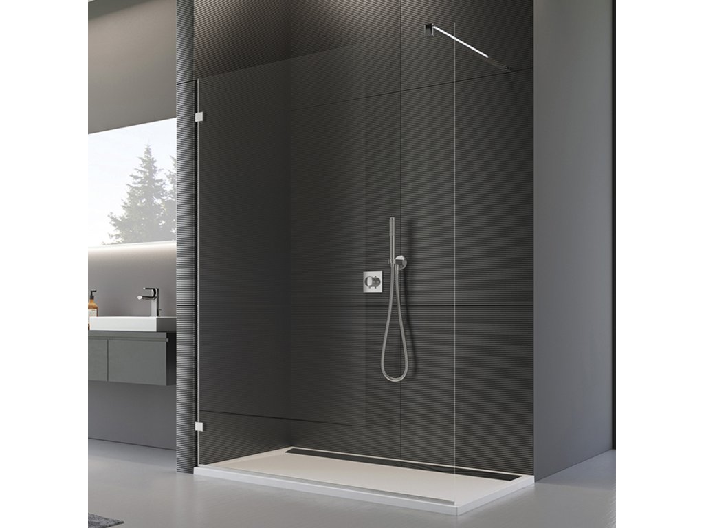 Walk-in zástěna RONAL s 8mm bezpečnostním sklem. Chromované L-kování s těsnicím profilkem. Součástí je stabilizační vzpěra 1250 mm. Antiplaková úprava skla AQUAPERLE pro snadné čištění. Walk-in zástěnu lze vybavit chromovaným držákem ručníku nebo skleněnou poličkou (za příplatek).Doplňkové parametry