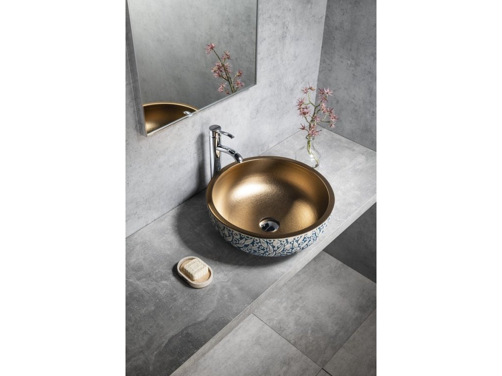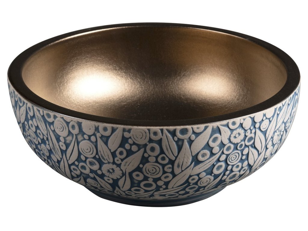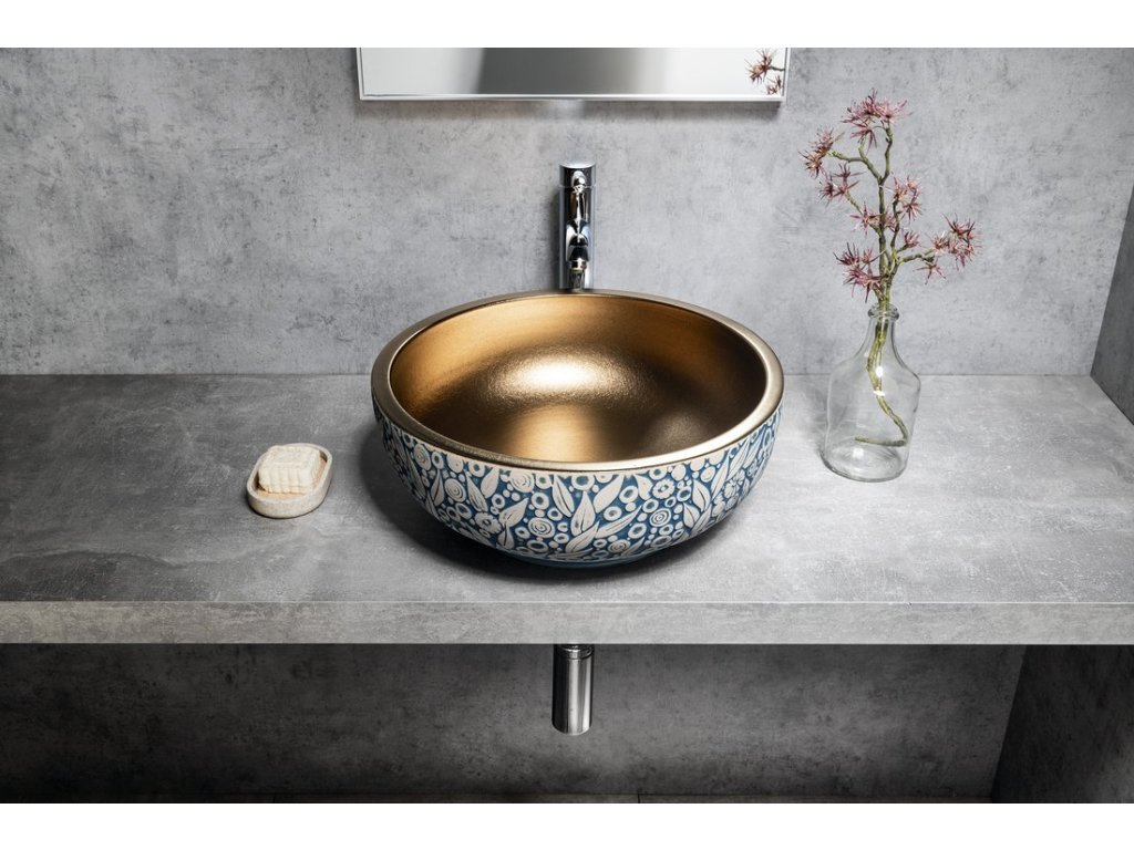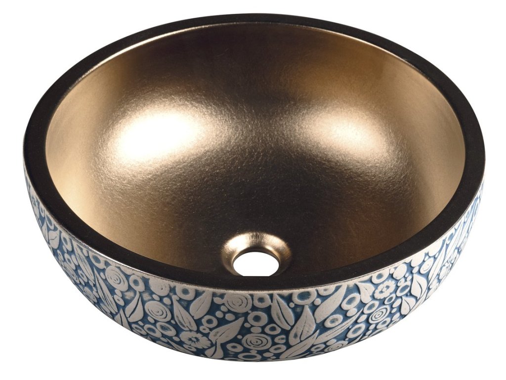 PRIORI keramické umyvadlo na desku, Ø 41 cm, měď/modrá se vzorem