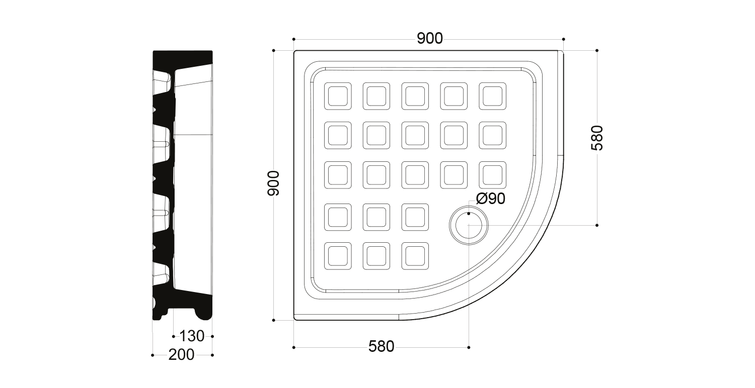 RETRO keramická sprchová vanička, čtvrtkruh 90x90x20cm, R550, bílá