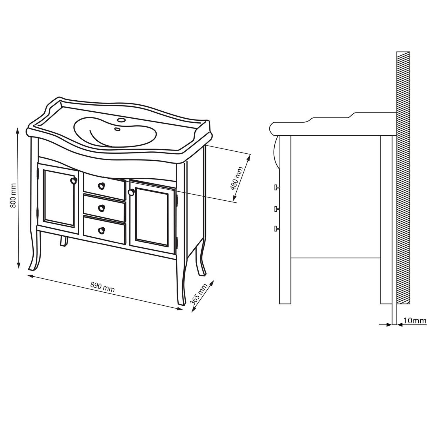 - Z důvodu instalace sifonu je horní zásuvka imitace = pouze pevné čelo
