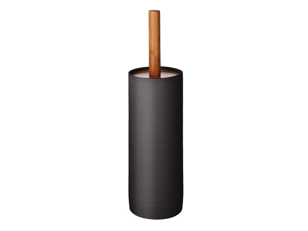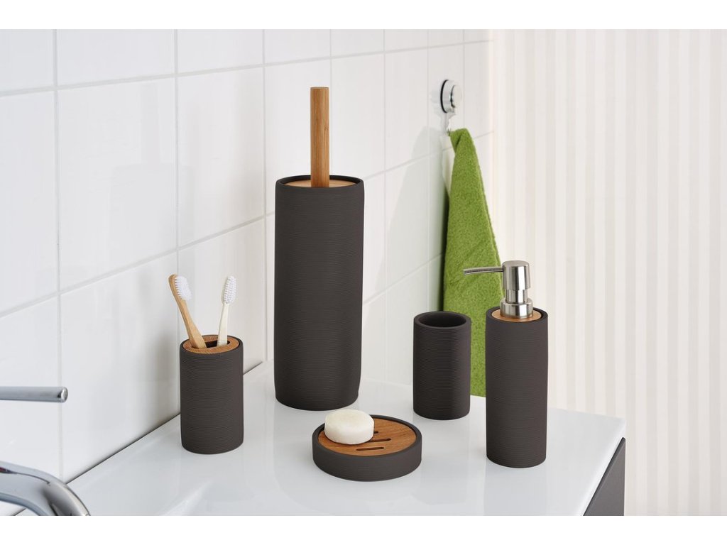 Jednoduché zdobení jemnými vodorovnými drážkami, kombinace s bambusem a tlumené zemité barvy si přímo říkají o umístění doplňků ROLLER do koupelny zařízené v přírodním stylu.