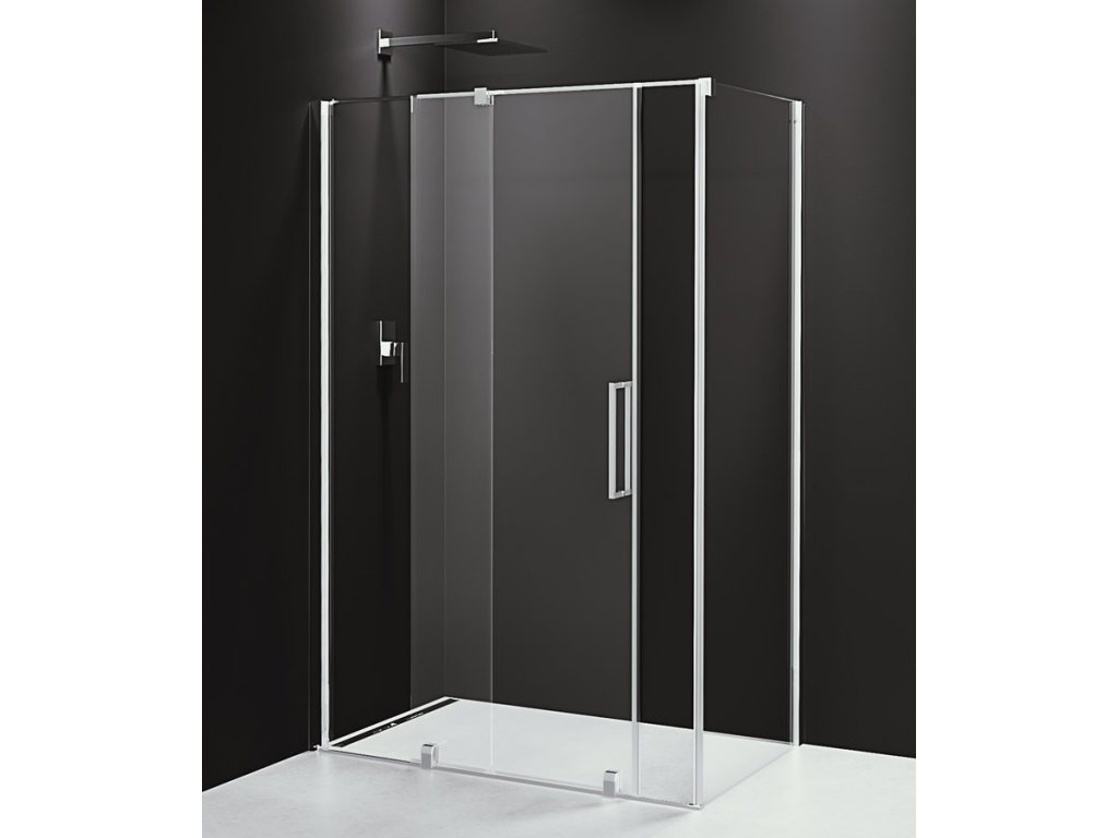 - Dvojdílné sprchové dveře do prostoru (pevná a posuvná část) s hliníkovými profily v chromu nebo matně černé povrchové úpravě