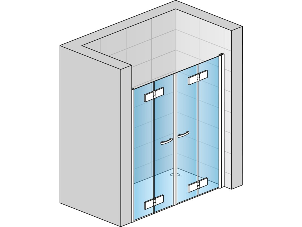 Bezbariérová sprchová zástěna od společnosti RONAL umožňuje velmi velkou šířku vstupu i na malém prostoru a zajišťuje opravdový komfort při sprchování. Dvoudílné sprchové dveře s magnetickým těsněním lze otvírat ven i dovnitř a také v polovině skládat. Když se zástěna nepoužívá, je možné sklopit dveře na zeď. Chromované panty jsou na vnitřní straně zapuštěné do skla. Praktický zdvihový mechanismus usnadňuje otvírání a zavírání dveří a zabraňuje předčasnému opotřebení těsnění na dveřích. 6mm bezpečnostní sklo s antiplakovou úpravou Aquaperle. 10mm prahová lišta. Chromované plastové dílky a madlo. Jedná se o dvoje dvoudílné dveře v rovině pro montáž do niky.Doplňkové parametry