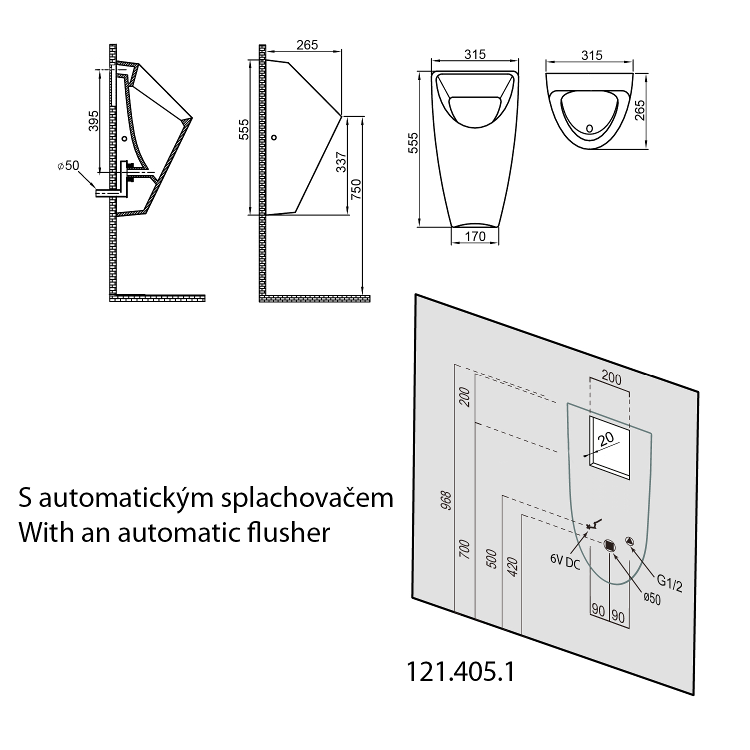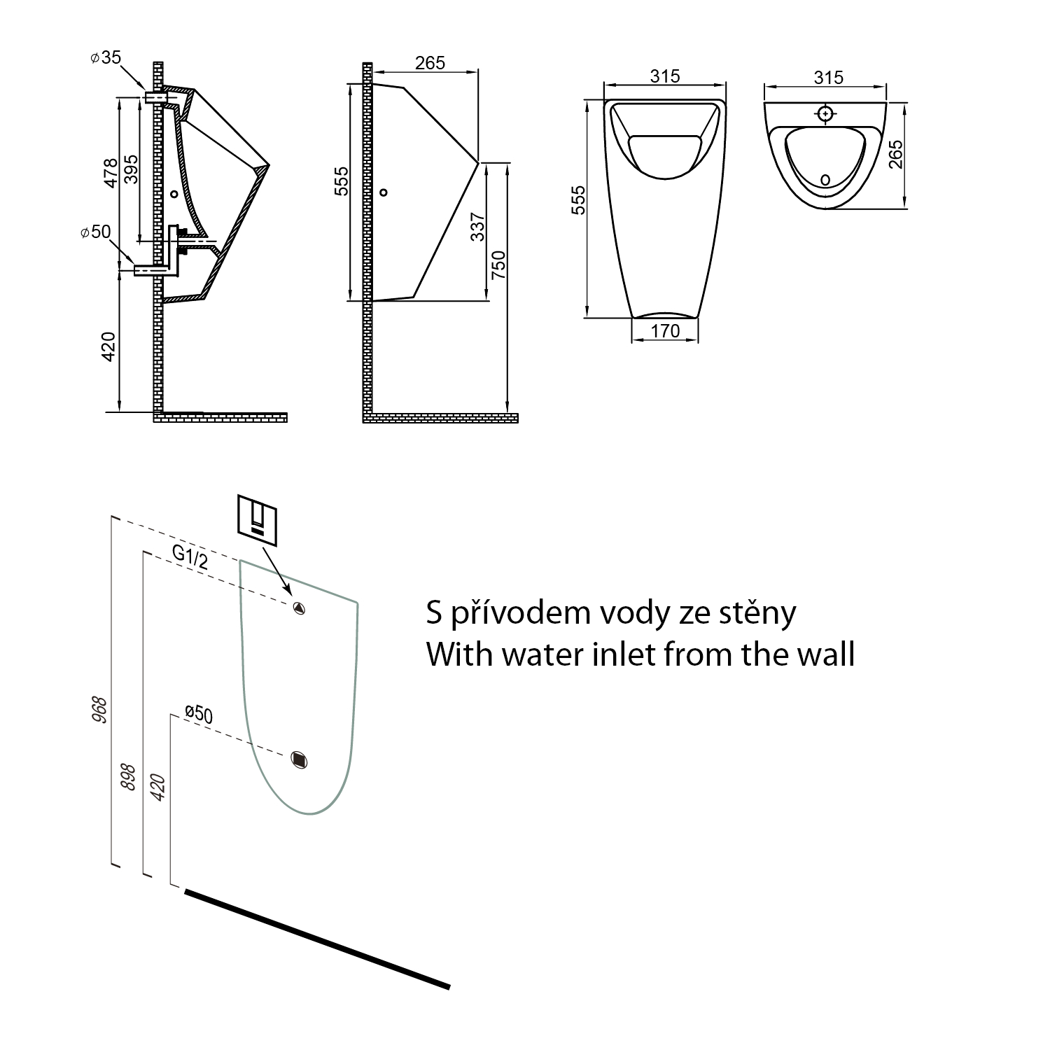 Pro skryté propojení přívodu k urinálu doporučujeme použít propojovací trubičku průměr 12mm, kompatibilní do manžety pisoáru a se závitem ½″ k nástěnce.