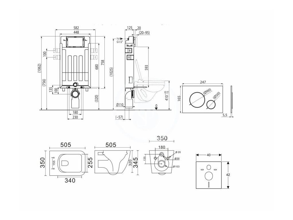 - Fixační set pro uchycení WC mísy: závitová tyč M12 – 2 ks, podložky – 4 ks, krytka – 2 ks, matice – 2 ks, chránička závitu – 2 ks