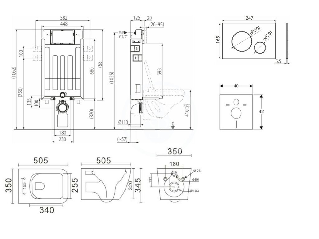 - Fixační set pro uchycení WC mísy: závitová tyč M12 – 2 ks, podložky – 4 ks, krytka – 2 ks, matice – 2 ks, chránička závitu – 2 ks