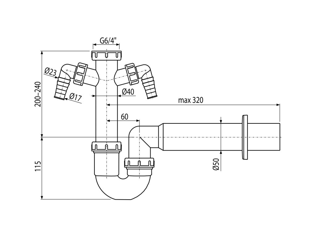 Sifon trubkový s převlečnou maticí 6/4" a dvěma přípojkami