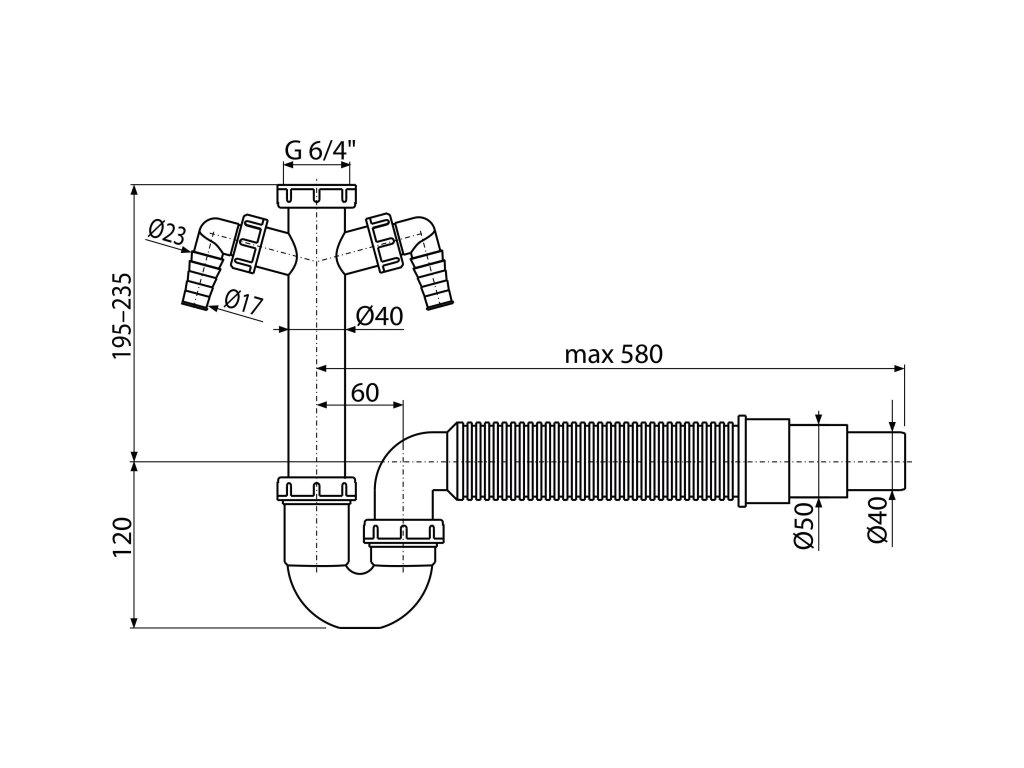 Sifon trubkový s převlečnou maticí 6/4", dvěma přípojkami a flexi hadicí
