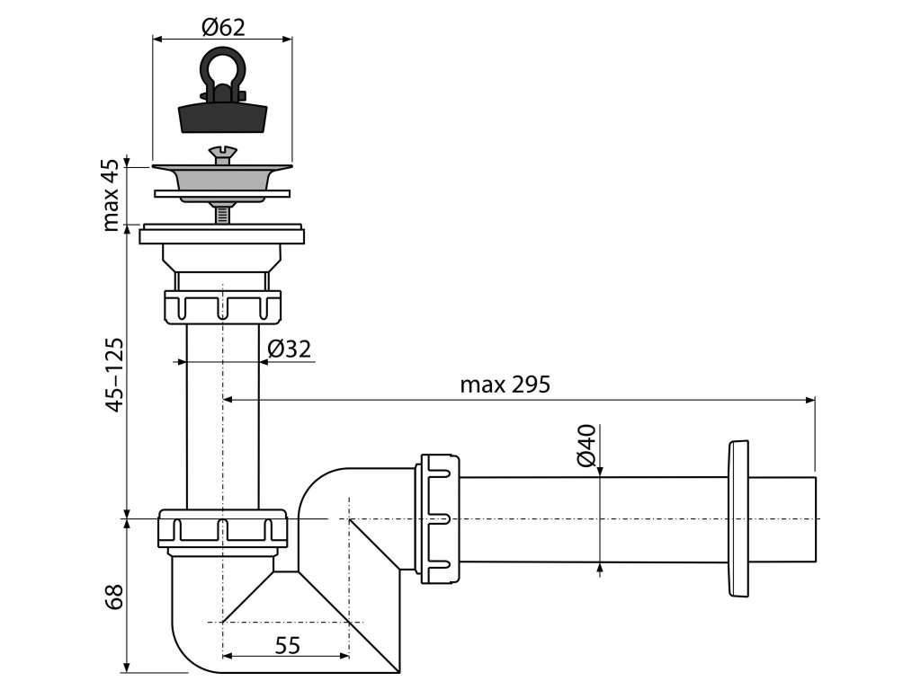 Sifon umyvadlový „S“ DN40 s nerezovou mřížkou DN63