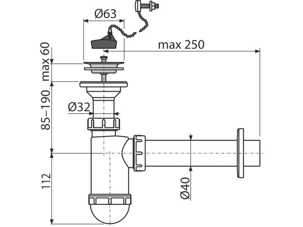 Sifon umyvadlový DN40 s nerezovou mřížkou DN63, řetízek