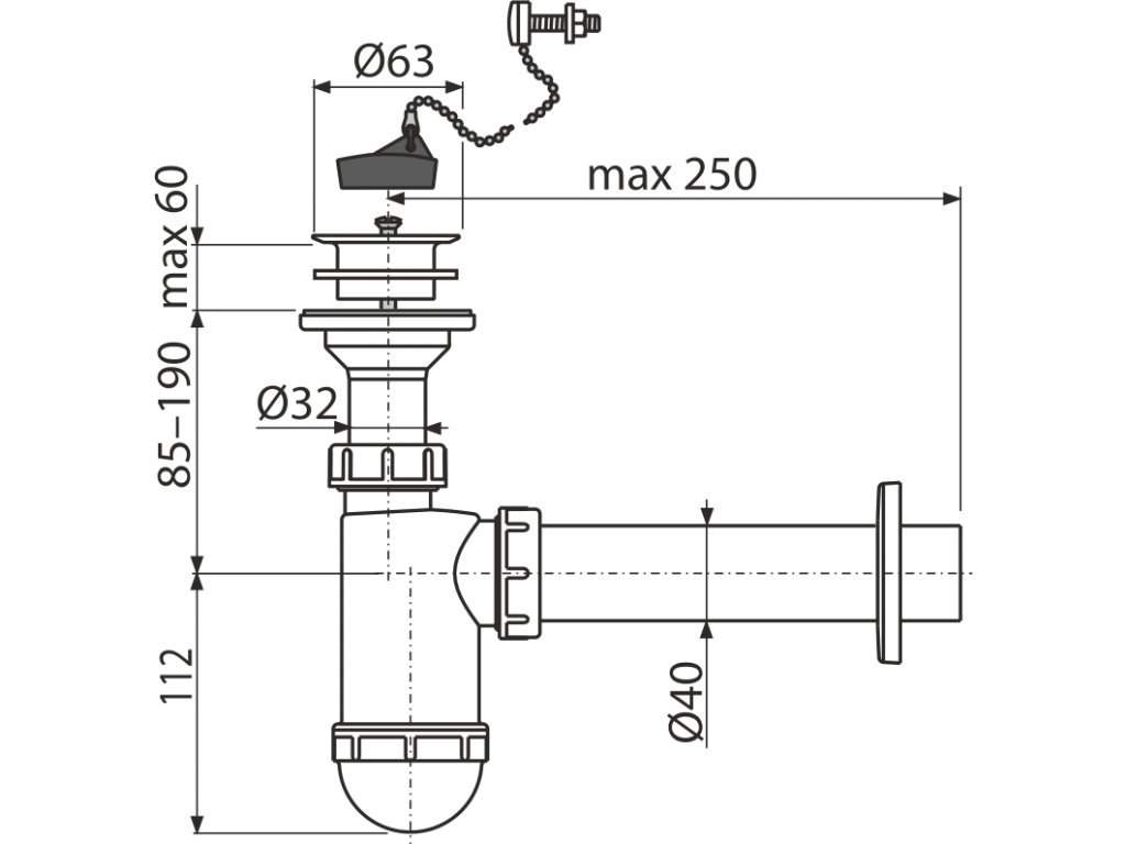 Sifon umyvadlový DN40 s plastovou mřížkou DN63, řetízek