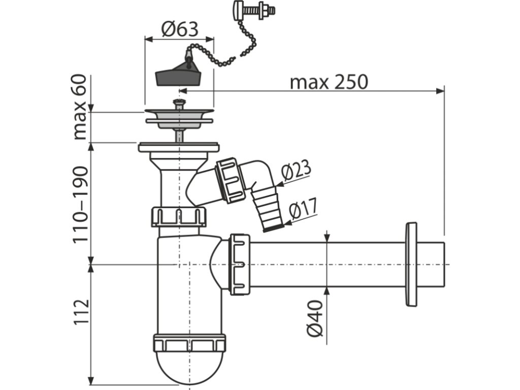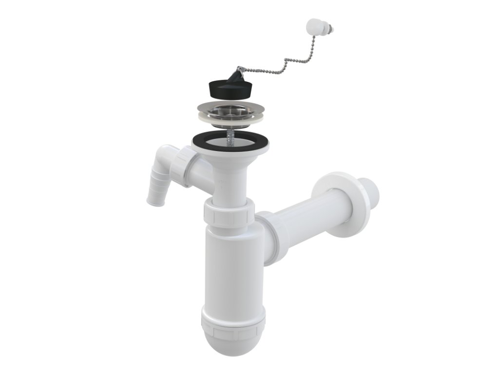 Sifon umyvadlový DN40 s přípojkou a nerezovou mřížkou DN63, řetízek