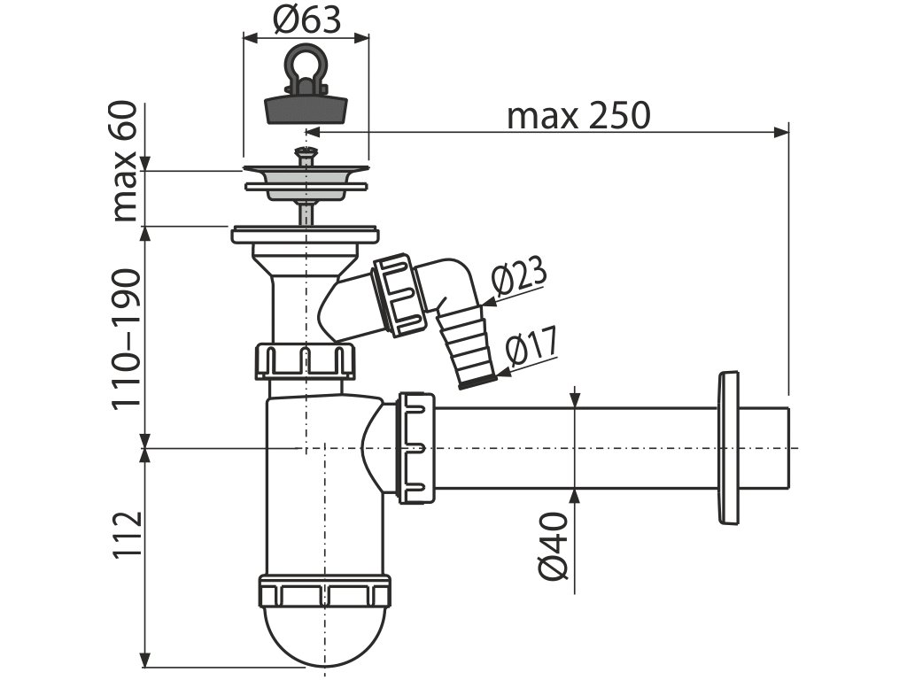 Sifon umyvadlový DN40 s přípojkou a nerezovou mřížkou DN63