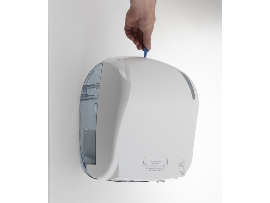Plastový zásobník na papírové ručníky v roli s automatickým ořezem. Výkonný řezací mechanismus umožňuje plynulé dávkování po jednom útržku. Velká kapacita snižuje nutnost častého doplňování. Ideální pro rušné toalety např. ve školách, továrnách nebo na letištích.