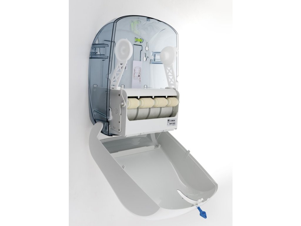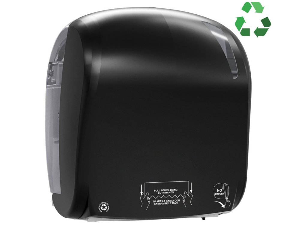 Plastový zásobník na papírové ručníky v roli s automatickým ořezem. Výkonný řezací mechanismus umožňuje plynulé dávkování po jednom útržku. Velká kapacita snižuje nutnost častého doplňování. Ideální pro rušné toalety např. ve školách, továrnách nebo na letištích.