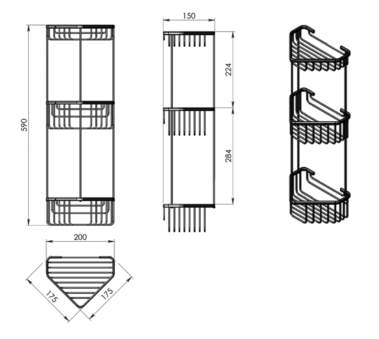 SMART třípatrová rohová police 175x590x175mm, chrom