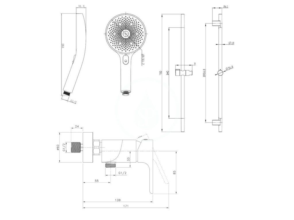 Sprchový set s baterií, tyčí, hadicí a sprchovou hlavicí, chrom