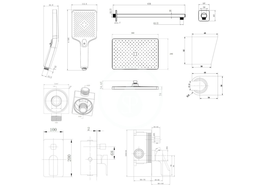 horní sprchu 360 x 240 mm se sprchovým ramenem 430 mm