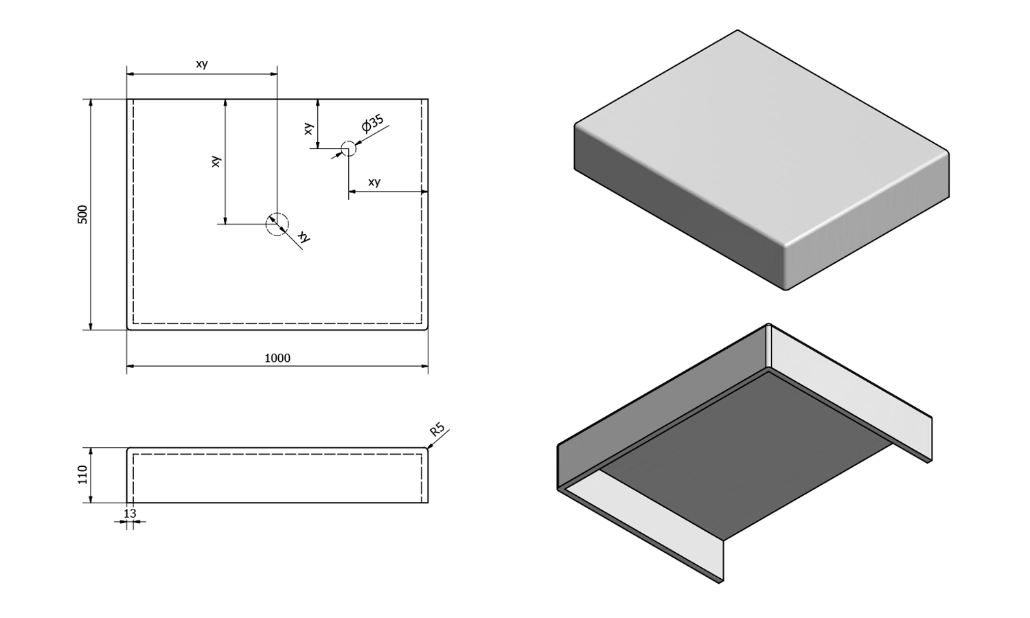 - Možnost dodání s otvory pro baterii a odpad dle výkresu (lze vrtat i v místě instalace)