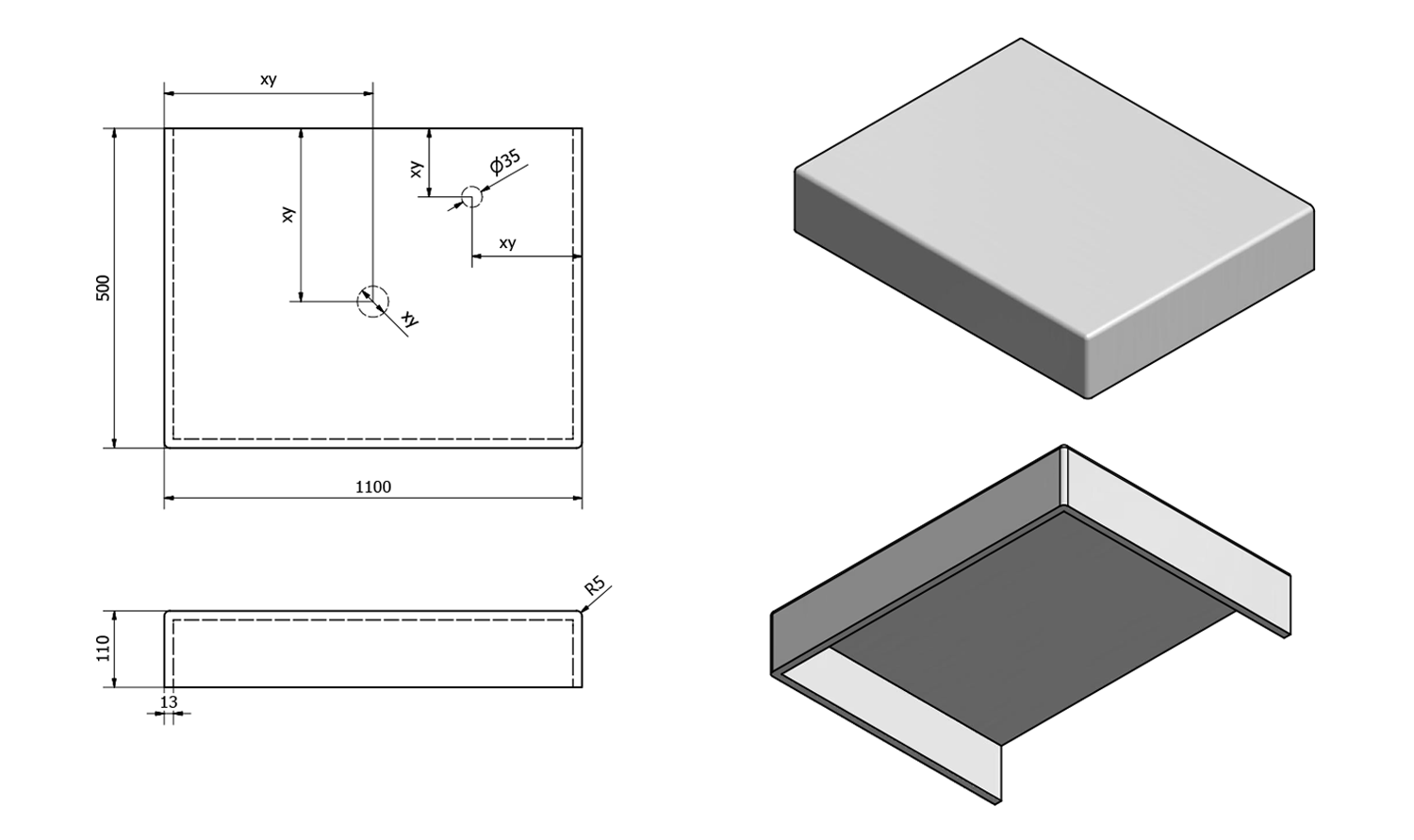 - Možnost dodání s otvory pro baterii a odpad dle výkresu (lze vrtat i v místě instalace)