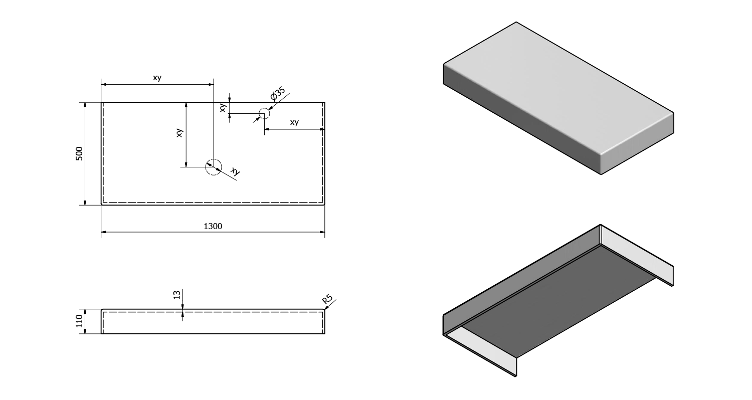 - Možnost dodání s otvory pro baterii a odpad dle výkresu (lze vrtat i v místě instalace)