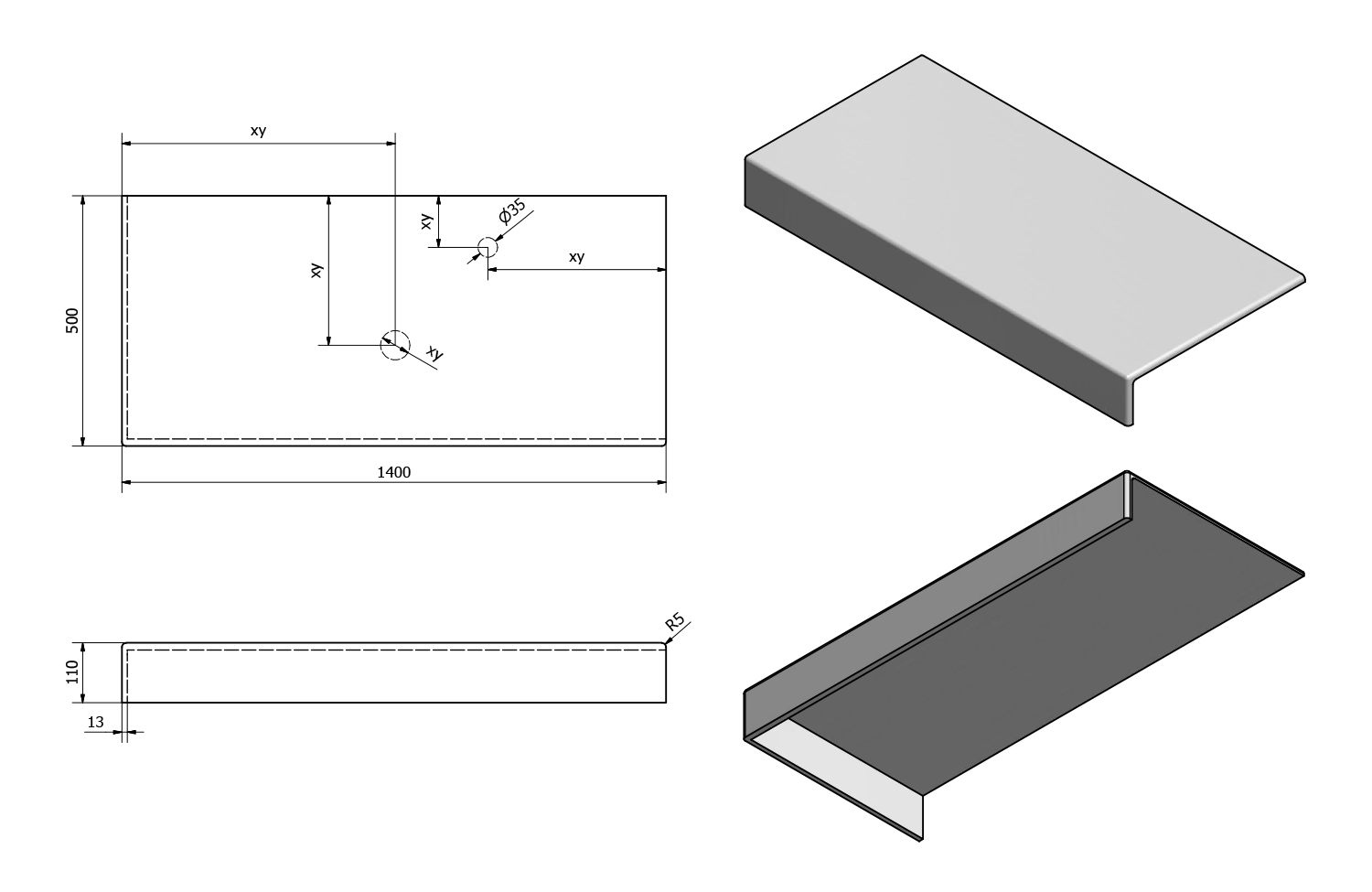 - Možnost dodání s otvory pro baterii a odpad dle výkresu (lze vrtat i v místě instalace)