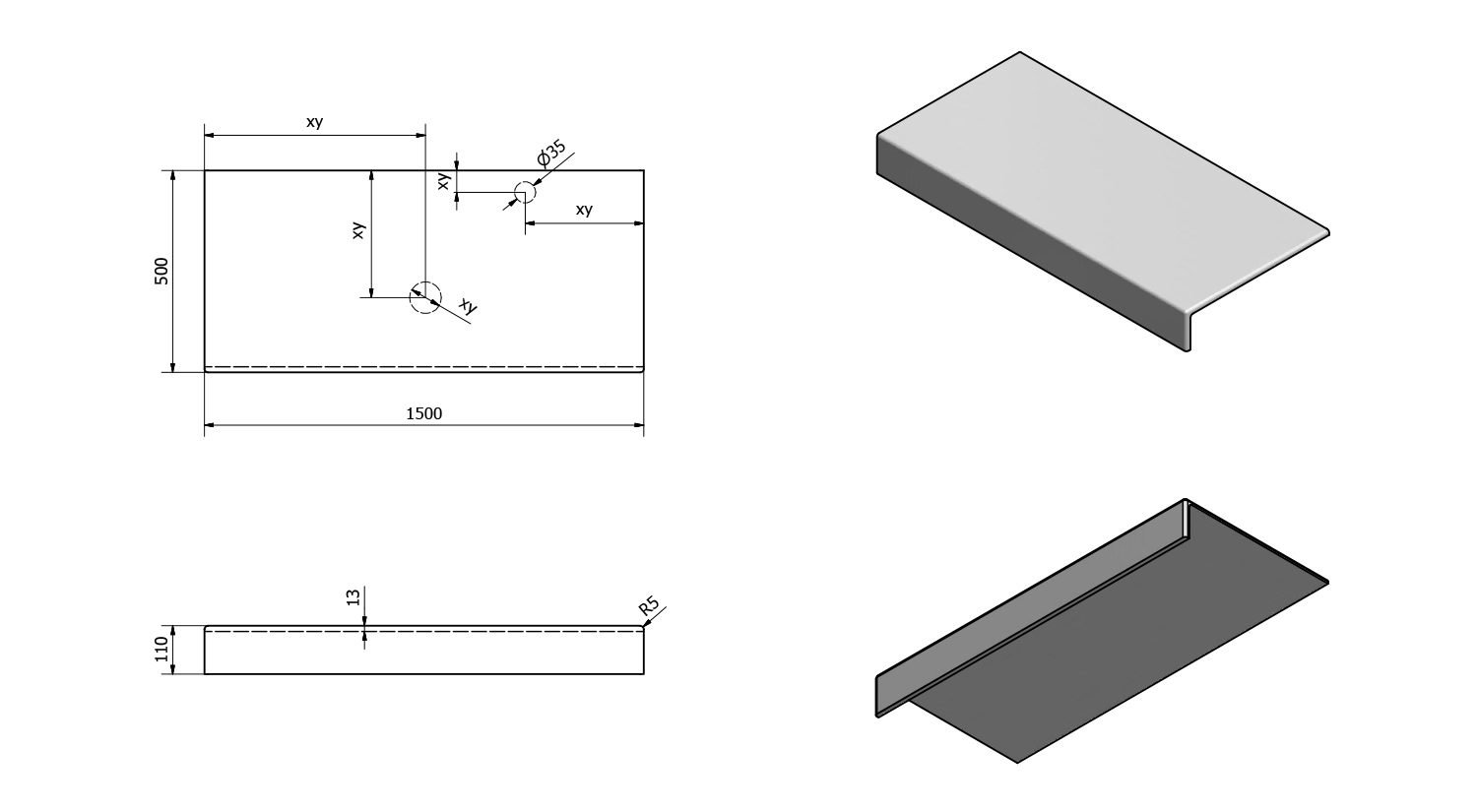 - Možnost dodání s otvory pro baterii a odpad dle výkresu (lze vrtat i v místě instalace)