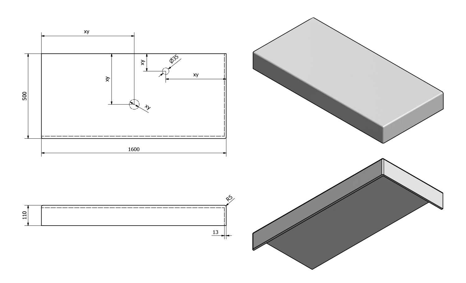 - Možnost dodání s otvory pro baterii a odpad dle výkresu (lze vrtat i v místě instalace)