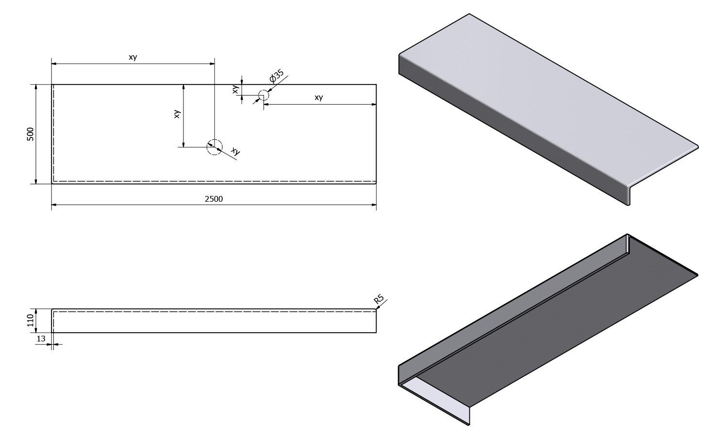- Možnost dodání s otvory pro baterii a odpad dle výkresu (lze vrtat i v místě instalace)