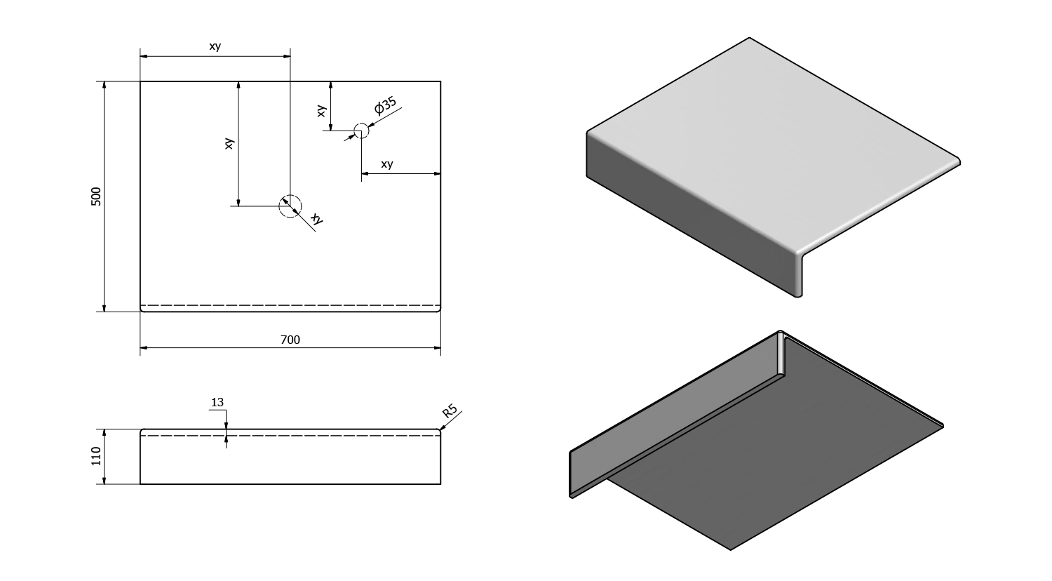 - Možnost dodání s otvory pro baterii a odpad dle výkresu (lze vrtat i v místě instalace)