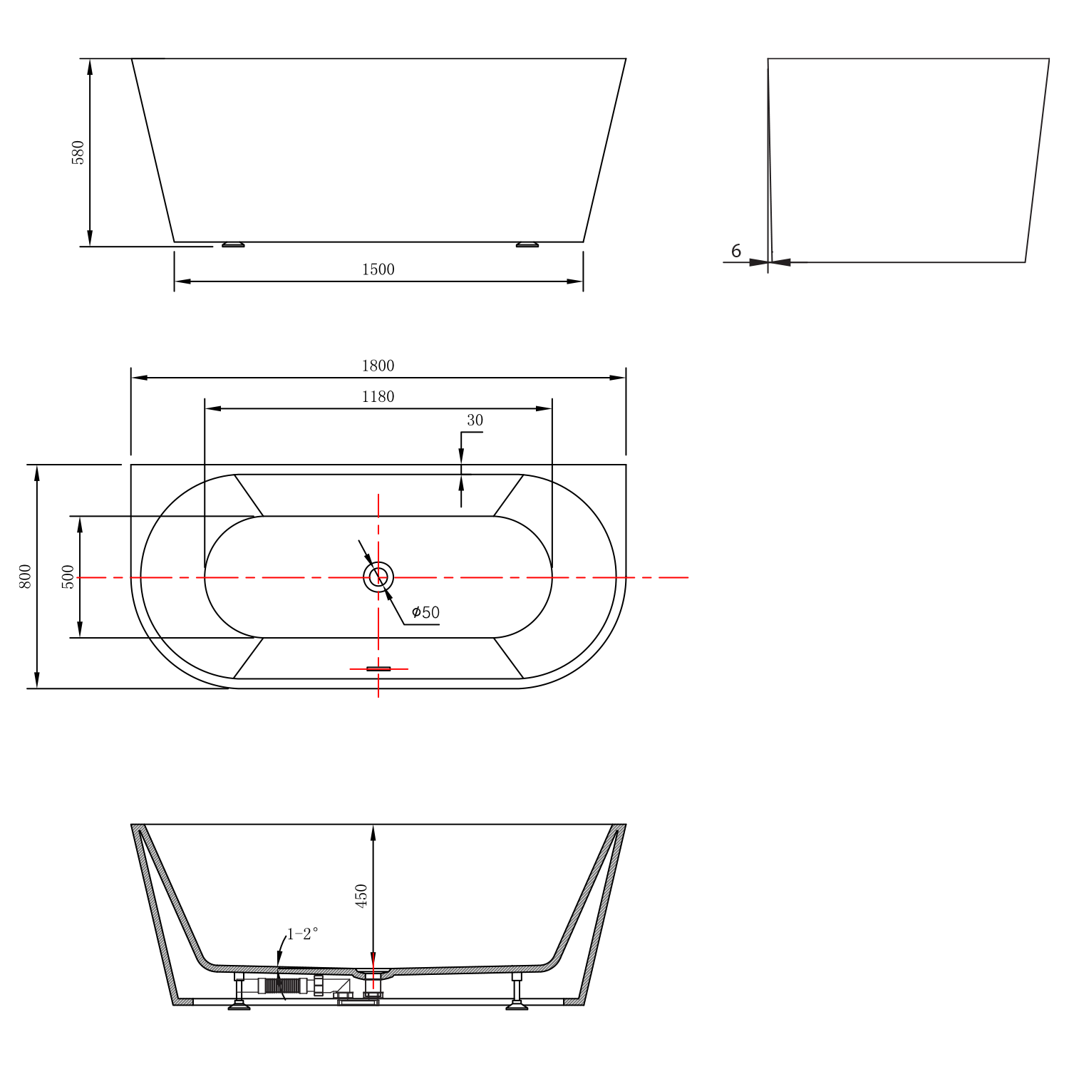 TAJO nástěnná stojící vana, 180x80cm, bílá