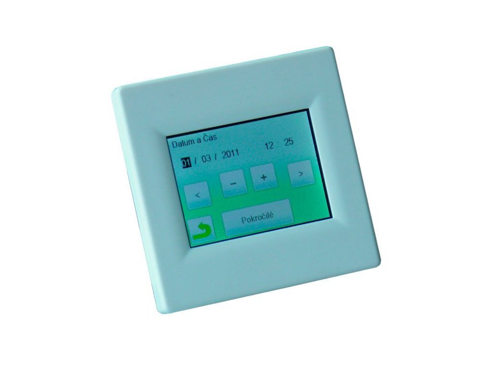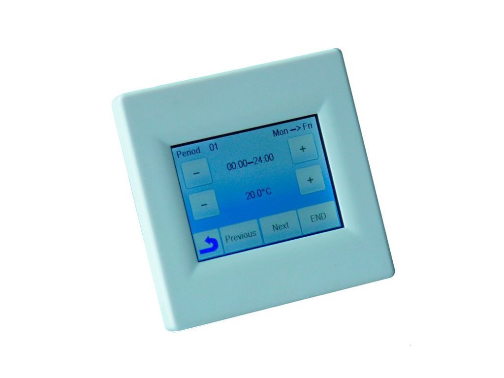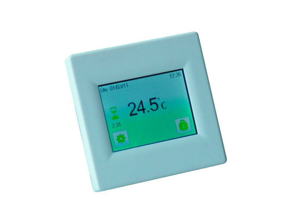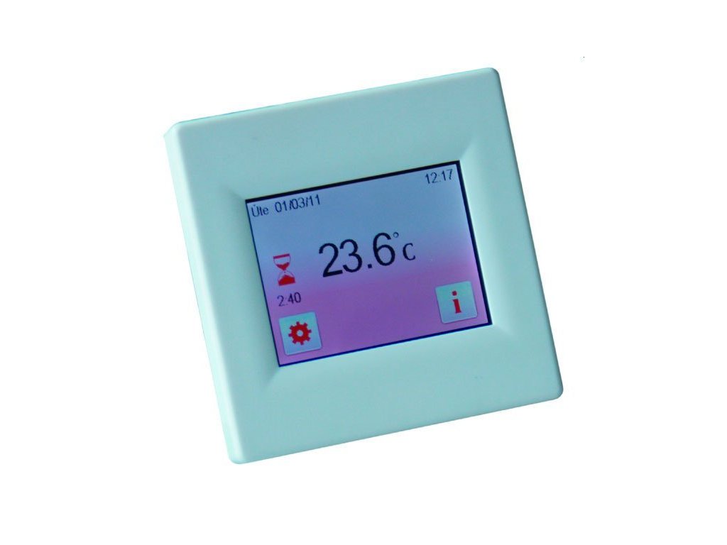 Programovatelný univerzální termostat - snímá teplotu prostoru i podlahy. Dotykový (uzamykatelný) displej s volitelnou barvou pozadí, CZ menu, volba měřených teplot: "podlaha/prostor/podlaha+prostor/2x podlaha+prostor"; nastavitelný typ regulace: pevná teplotní diference nebo PWM (pulzní šířková modulace); počítání provozních nákladů (den/měsíc/rok); zobrazení teploty prostoru i podlahy.