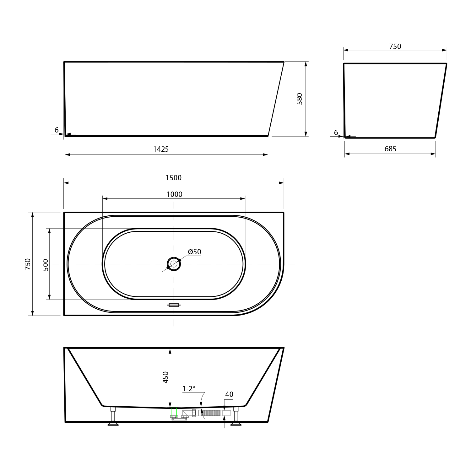 TIBERA L rohová stojící vana, 150x75cm, bílá
