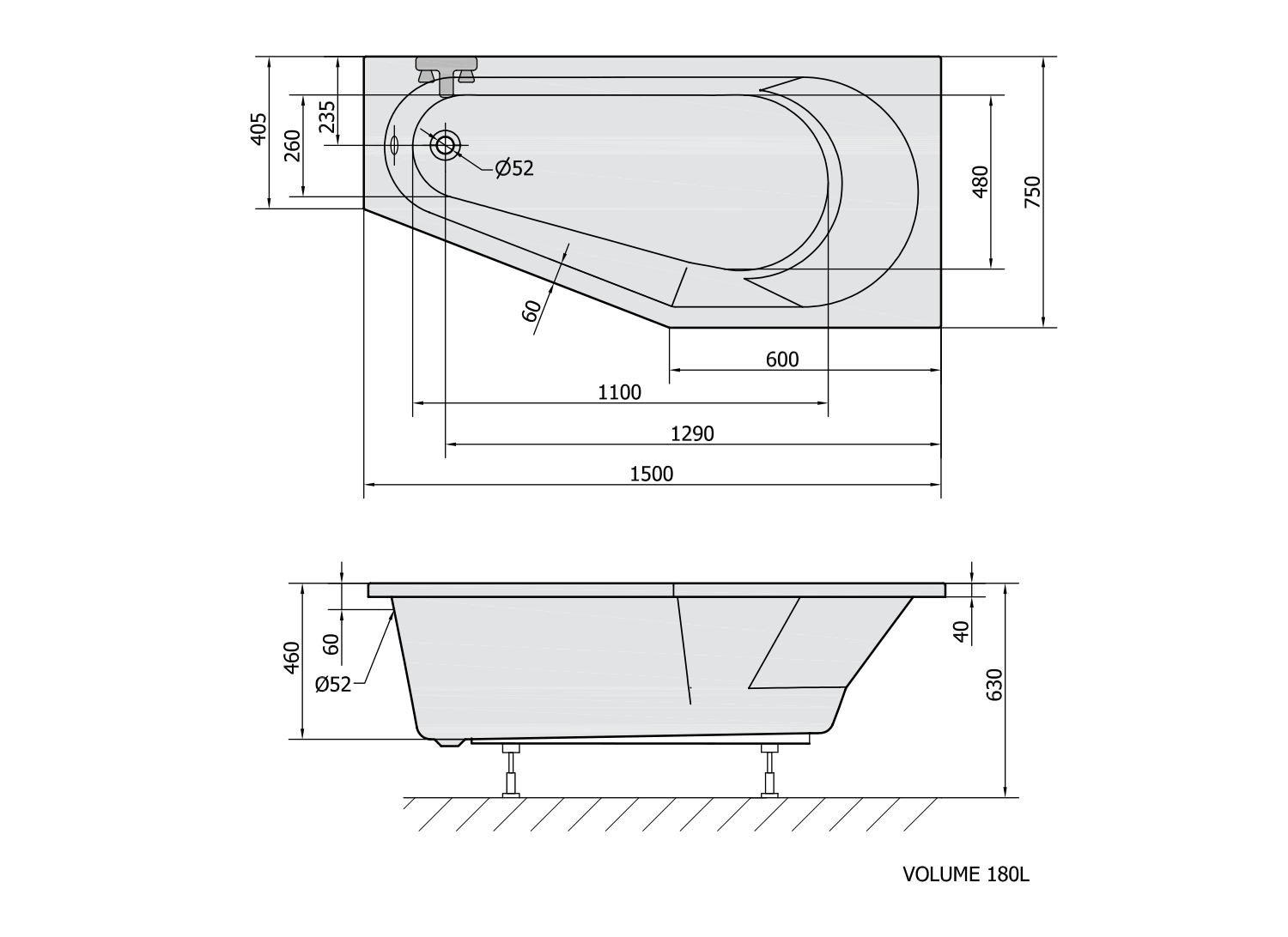 TIGRA R asymetrická vana 150x75x46cm, bílá