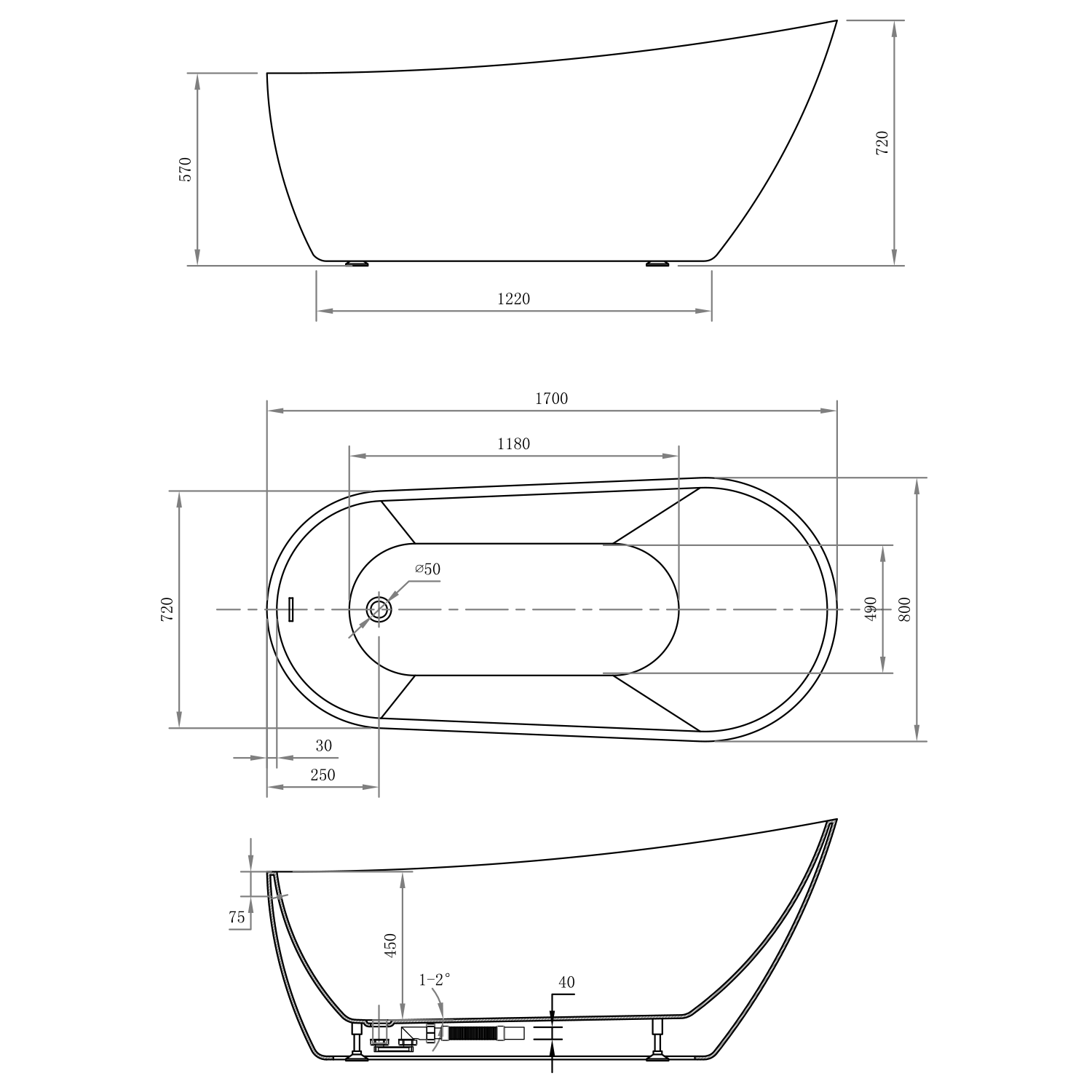 TISA volně stojící vana, 170x80cm, bílá