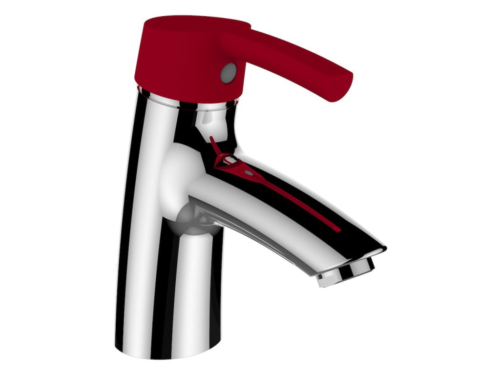 Extended Description: | Umyvadlová páková baterie, s výtokem 110 mm bez automatické výpusti, červená ovládací páčka |