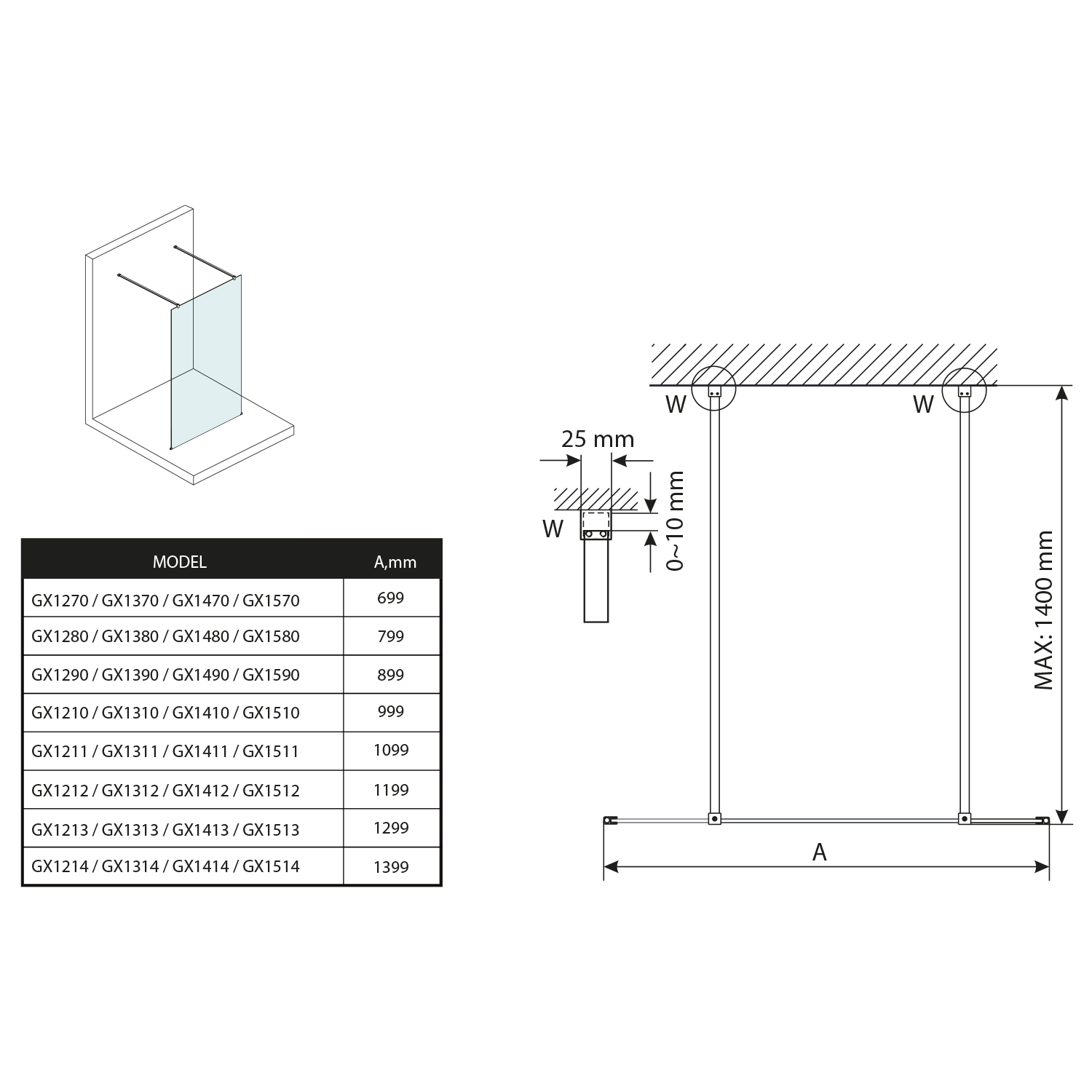 - Zástěny v šířkách 700 až 1400 mm