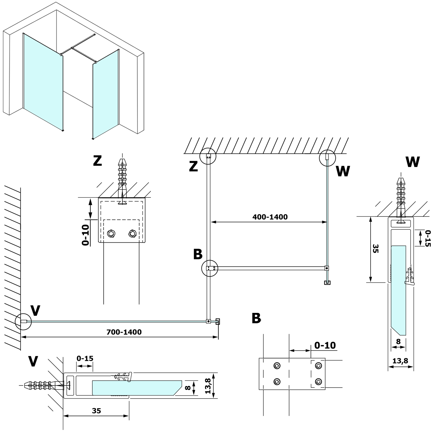 - Zástěny v šířkách 700 až 1400 mm
