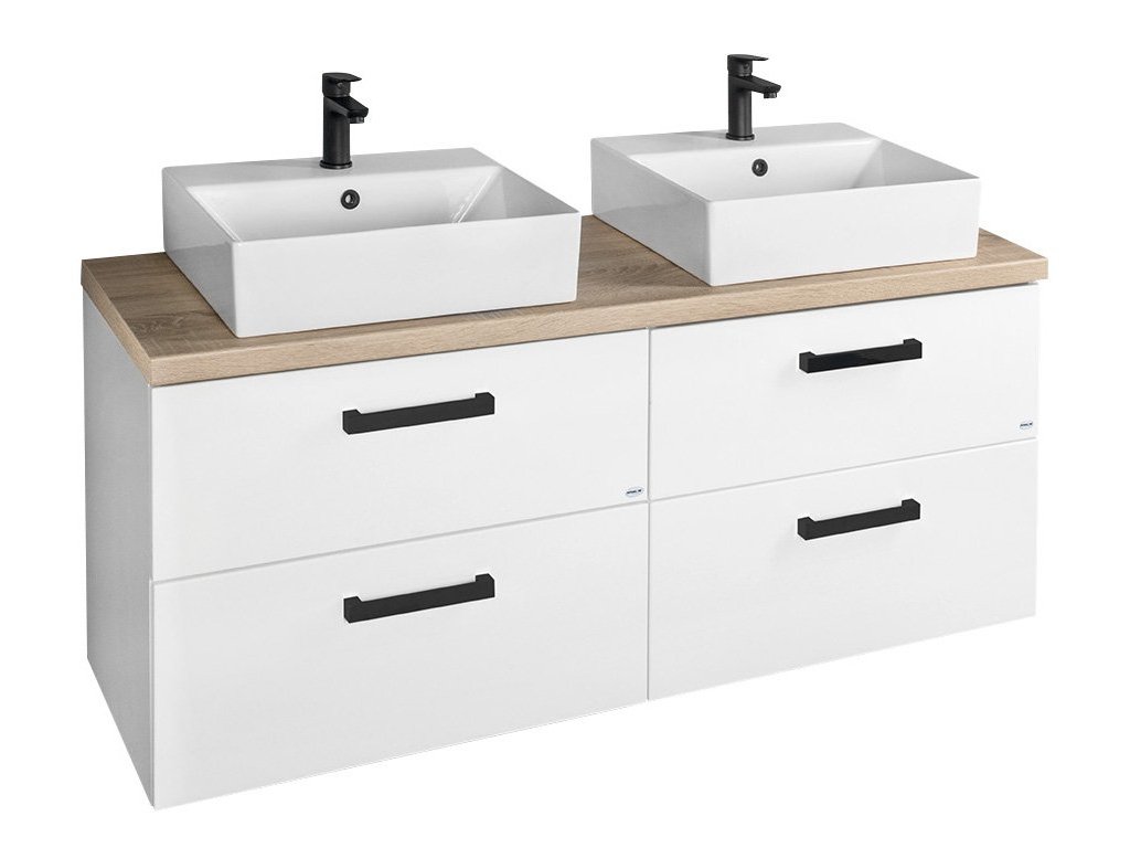 Koupelnový nábytek VEGA s deskou VEGA (HPL) v dekoru dub platin lze kombinovat s umyvadly na postavení.